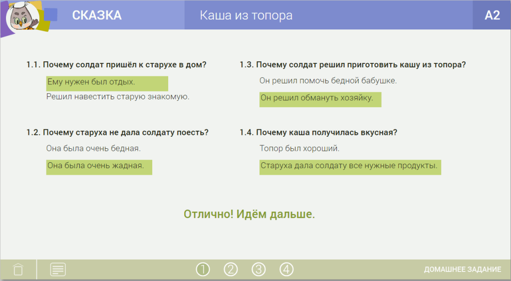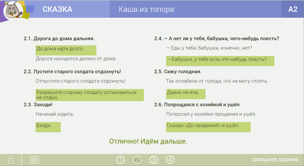 ![]() | А солда́т чу́вствует, что в до́ме пирога́ми па́хнет. Тут уви́дел он в углу́ топо́р – и говори́т стару́хе: – Е́сли еды́ у тебя́ нет, то мо́жно свари́ть ка́шу из топора́. Хозя́йка удиви́лась: – Как это – ка́шу из топора́ вари́ть? – А я тебе́ покажу́, е́сли дашь котёл. Интере́сно ста́ло стару́хе, принесла́ она́ котёл. Солда́т нали́л туда́ воды́, в во́ду положи́л топо́р и поста́вил котёл с топоро́м на ого́нь. Пото́м доста́л из рюкзака́ ло́жку, помеша́л, попро́бовал. |