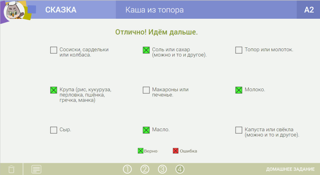 | – Ну как? – спра́шивает стару́ха. – Отли́чный топо́р! Хоро́шая ка́ша бу́дет! – отвеча́ет солда́т. – Жаль то́лько, что посоли́ть не́чем. – Ну, соль у меня́ есть, посоли́. Принесла́ стару́ха соль. Солда́т посоли́л во́ду с топоро́м, сно́ва помеша́л, попро́бовал. – Хороша́ ка́ша! Жаль, крупы́ нет! Тогда́ стару́ха – о́чень ей хоте́лось ка́шу из топора́ попро́бовать! – принесла́ и крупу́. – Положи́, солда́т, крупы́, ско́лько ну́жно. Положи́л солда́т крупу́. Ва́рит ка́шу, ло́жкой в котелке́ поме́шивает. Попро́бовал… – Хороша́ ка́ша! Вот е́сли бы туда́ ещё и ма́сла немно́го… Нашла́ стару́ха и ма́сло. Положи́ли ма́сла в ка́шу. Попро́бовал солда́т – и говори́т: | ![]() |